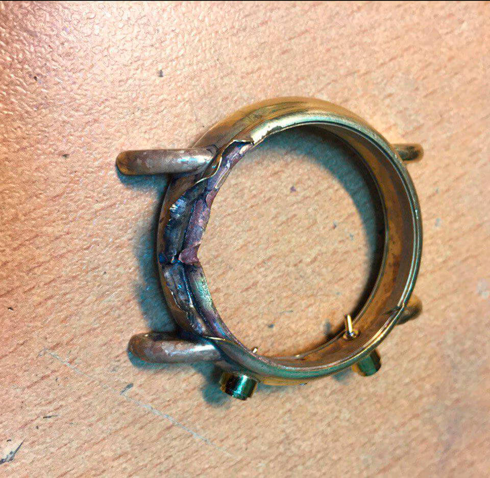 Корпус фальшивых часов с пробой золота 750. Неглубокий надпил не позволит определить фальшивку. На фото хорошо видны внутренности поддельных золотых часов.